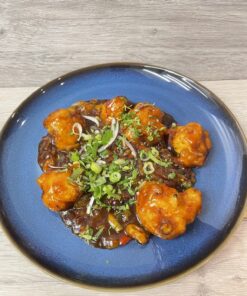 A delicious Indo-Chinese dish. Normally cooked with chicken, however this vegan twist is as good. Battered Cauliflower cooked with, garlic, chilli, soy sauce.